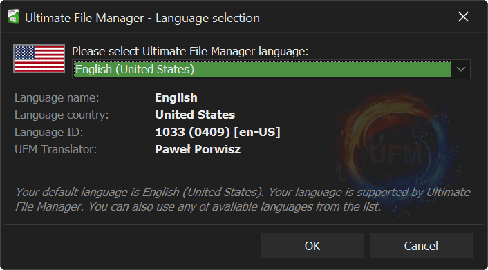 If you want, you can help Translate Ultimate File Manager into your language. All languages of Total Commander and Multi Commander File Managers are supported, but only a few of them are fully translated and therefore official. You can change this, you can devote your time and skills so that everyone else can use their favorite file manager even more efficiently. UFM Translation Manager is a special tool that can help with translation. It can be found in the project installation directory (\UFM\LANG\TranslationManager.exe). You can also simply open it using the „Ultimate File Manager” menu of the File Manager). It allows you to manage your translation files and test them in a real application/file manager.