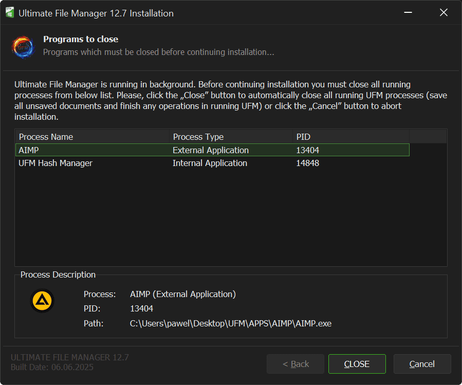 The list of processes to close shows the process name, type, and PID (process number in the operating system). The full path to the executable file that is blocking the installation is also displayed. Clicking the „Close” button will immediately close all active processes in the list (those launched from the directory of the existing Ultimate File Manager installation).