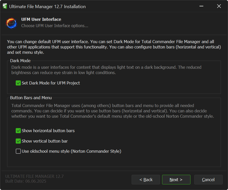 Next page of UFM Installer is User Interface options page. You can change the default UFM user interface. You can set Dark Mode for selected file manager and other applications that support this functionality. You can also configure the button bars (horizontal and vertical) and set the menu style for the Total Commander file manager.