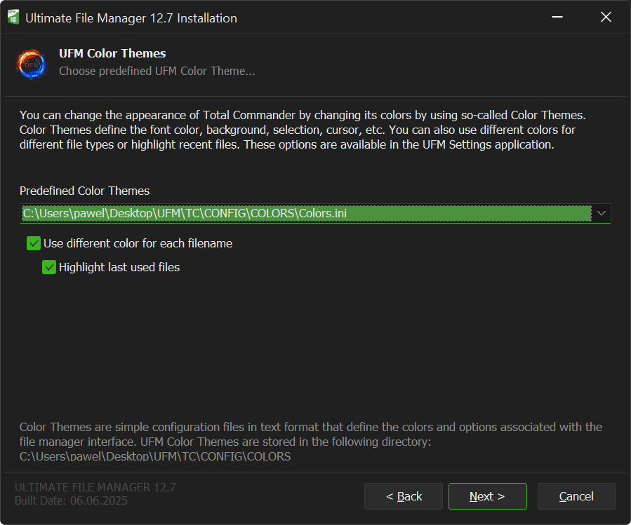 Next page of UFM Installer is the page for selecting predefined color schemes for Ultimate File Manager. You can change the appearance of Total Commander or Multi Commander file manager by changing its colors using so-called color schemes. Color schemes define the color of fonts, background, highlight, cursor, etc. They are simply configuration files in text format that define colors and options related to the file manager interface.