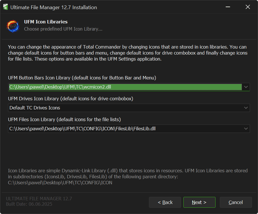 Next page of UFM Installer is the UFM predefined icon library selection page. You can change the look of Total Commander file manager by changing the icons that are stored in the icon libraries. You can change the default button bar and menu icons, you can change the default drive bar icons, and finally you can change the file list icons.