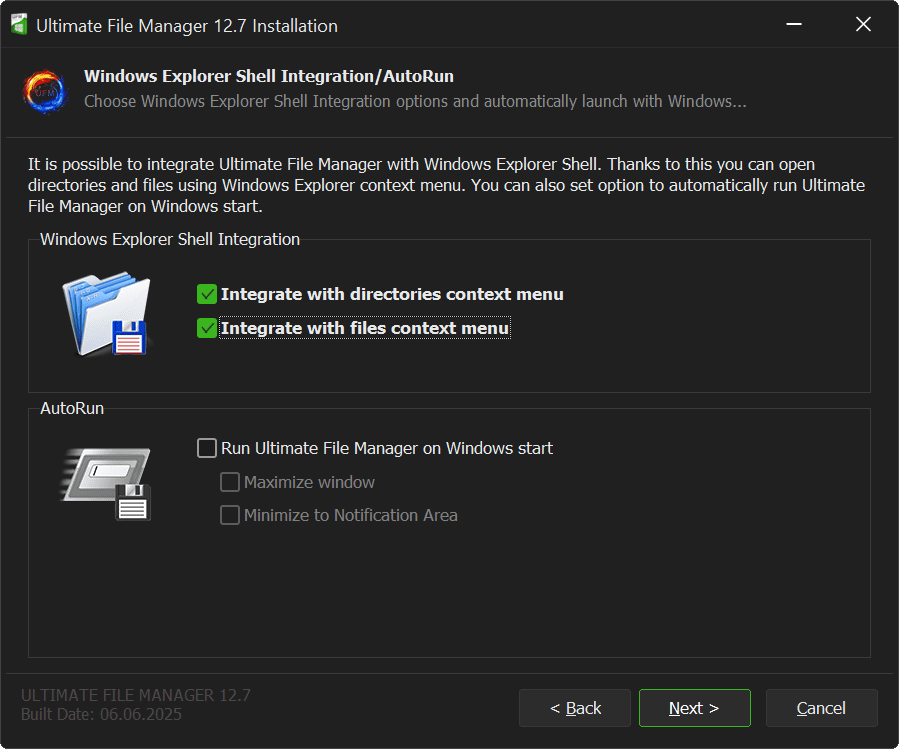Next page of UFM Installer is the page for integrating Ultimate File Manager with Windows Shell (File Explorer) and Autoruns with Windows.