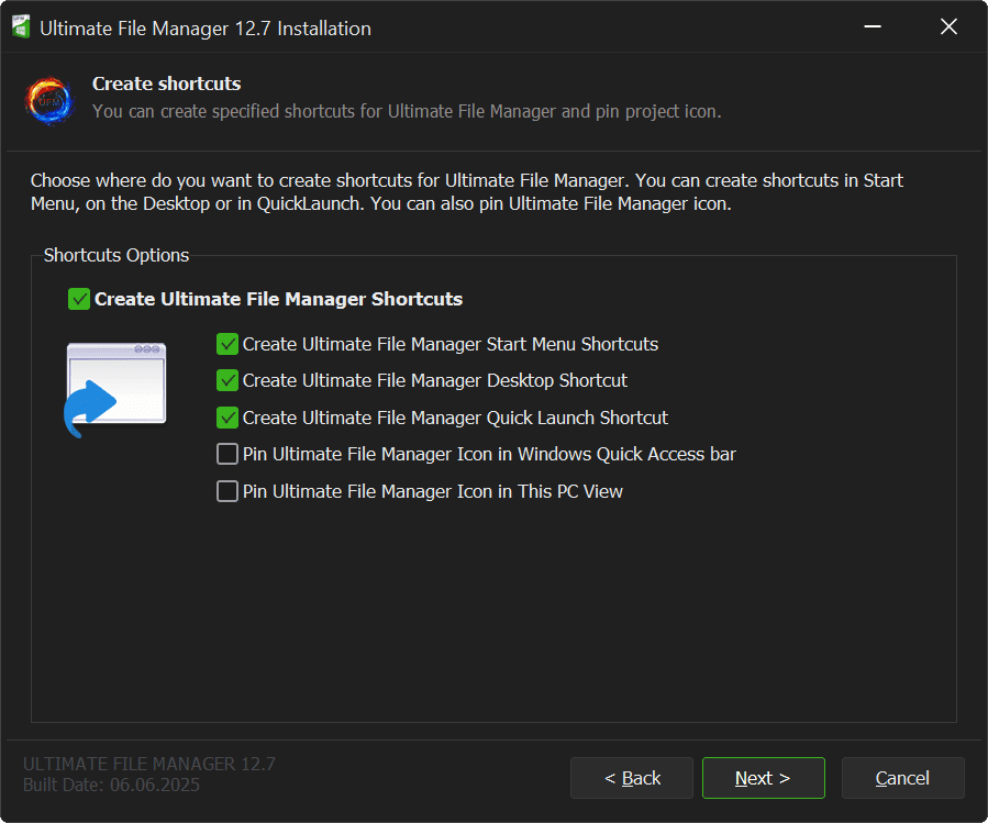 UFM installer in Standard Installation mode (sometimes called Normal) allows for full integration with the Operating System and Windows shell (File Explorer) - you can create shortcuts on the desktop, in the start menu, on the quick launch bar, you can pin the UFM icon on the Quick Access Bar or in the This PC View. You can also add command to context menu of folders, files and drives. You will create the appropriate entries in the Windows registry.