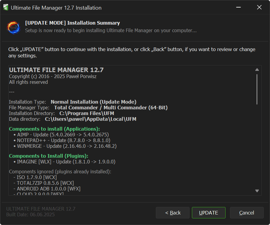 In Ultimate File Manager Update Mode, Summary Page also displays Installation Update status of UFM third-party applications and Total Commander File Manager plugins.