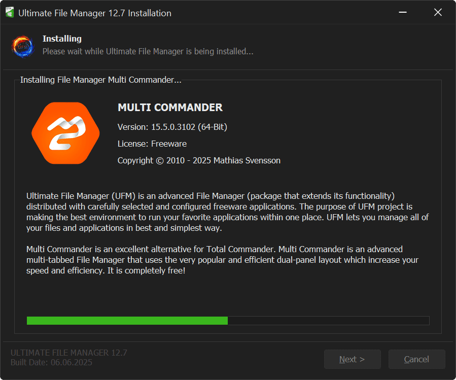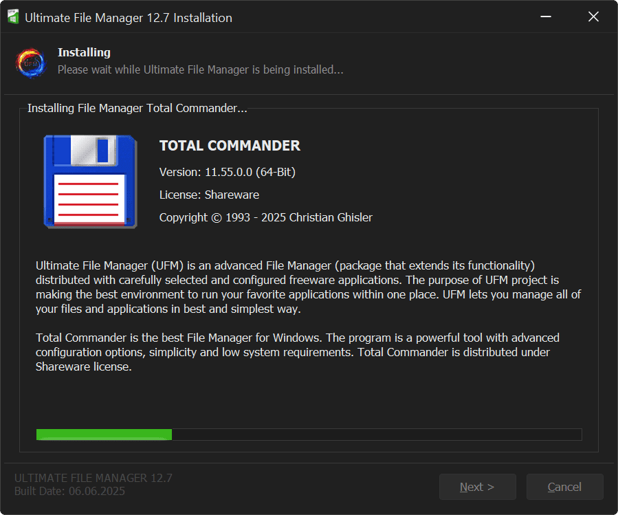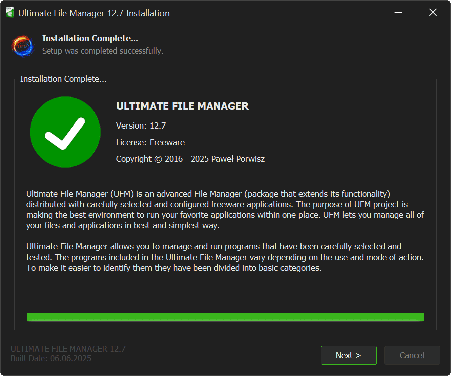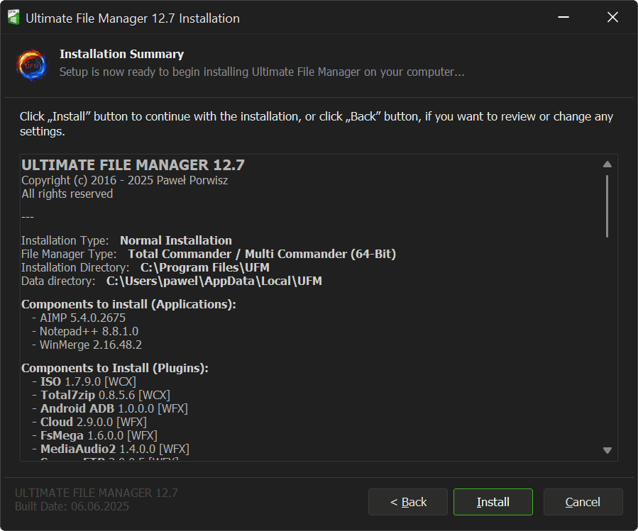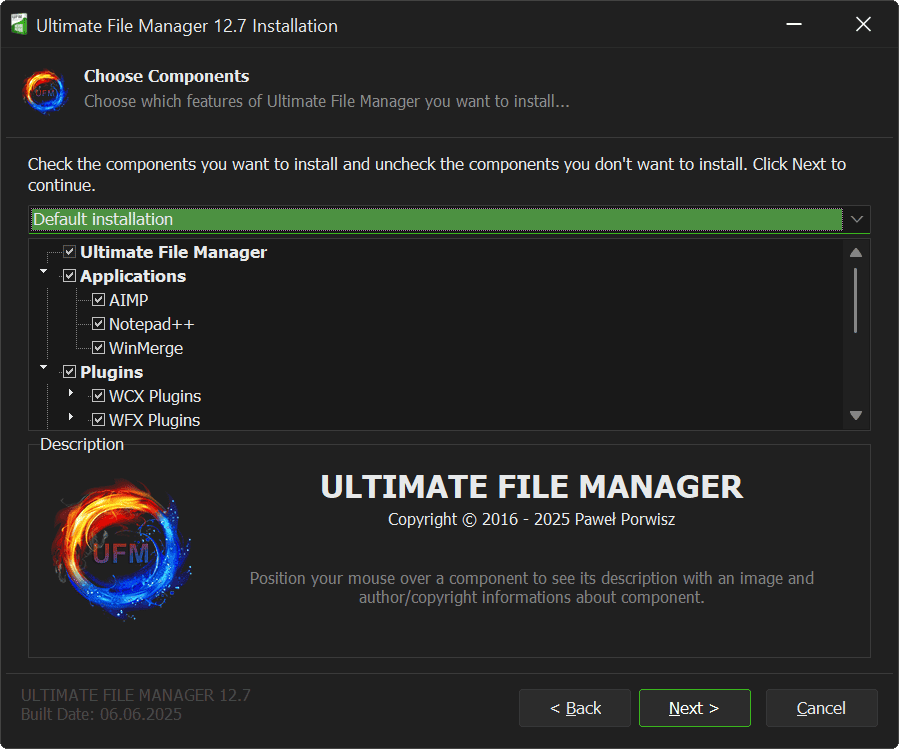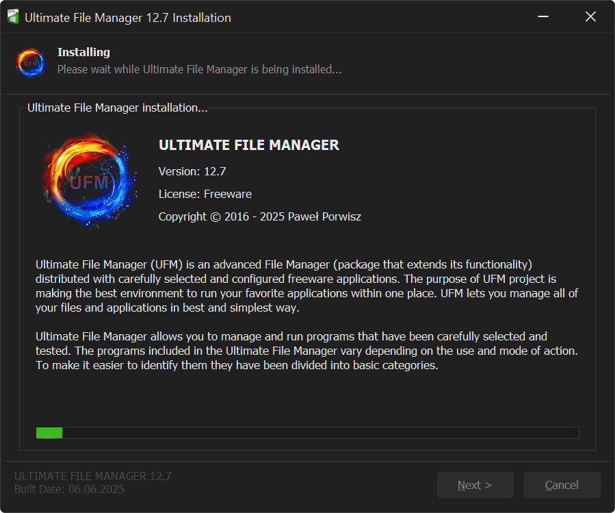 Ultimate File Manager is designed for Microsoft Windows platform and is distributed to the end user as installer written in NSIS and Delphi CE. Ultimate File Manager installer allows for easy and quick installation of selected components (a properly configured file manager, plug-ins/add-ons that extend its functionality, and appropriately selected external applications), with the option of choosing the installation mode, choosing the components to install, etc.