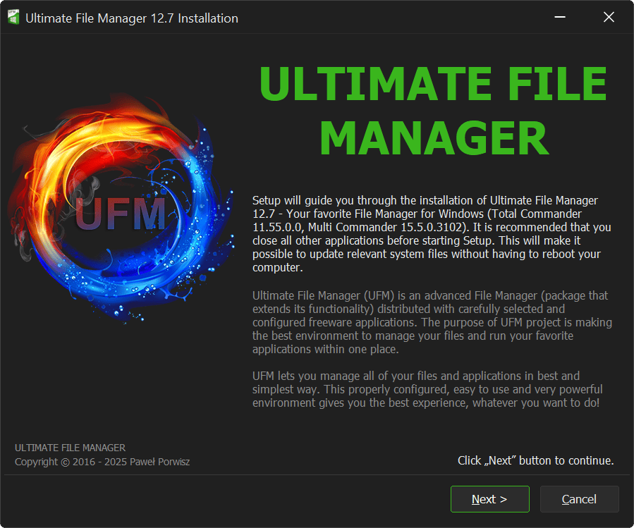 The first page of UFM Installer is Welcome Page. It is informative. Here we will find out what is being installed - the best file manager for the Windows platform.