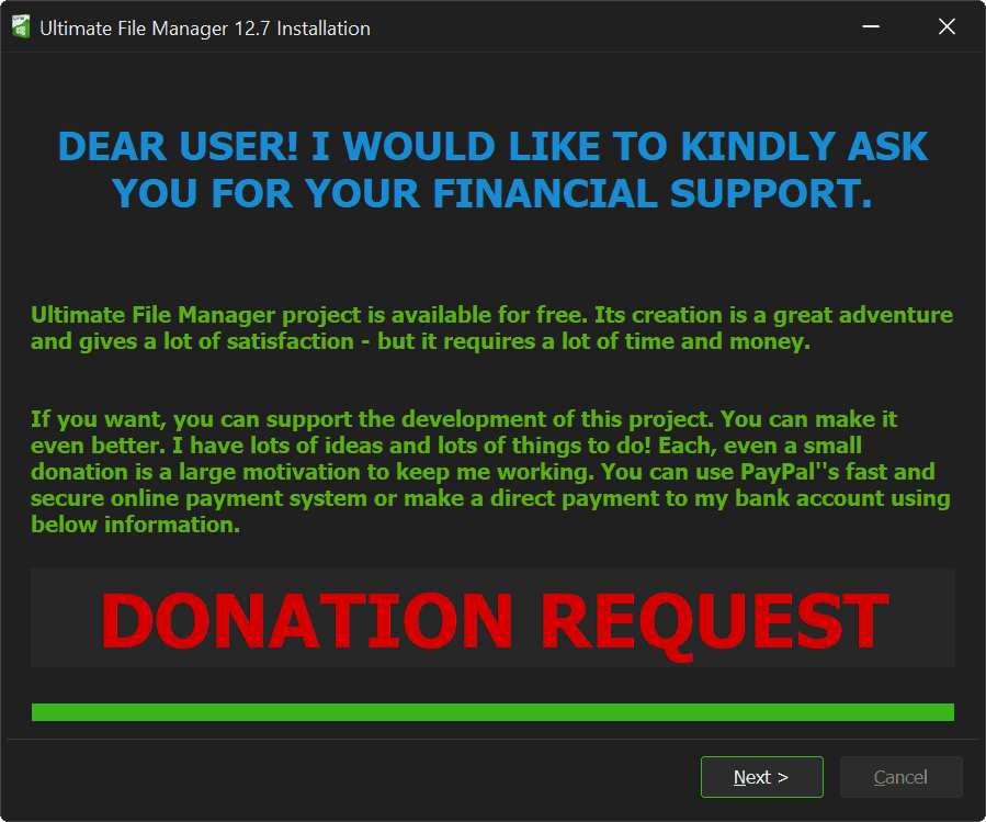 Next page of UFM Installer is the page that allows you to financially support the project - just click the DONATION REQUEST button and you will be redirected to the financial support page, which provides all the information and methods of support. Yes, I know - another page to click through, someone wants money again! I understand you! Nevertheless, I ask you, dear user, for a moment of reflection and consider Financial Support for the project. It is unfortunately necessary.