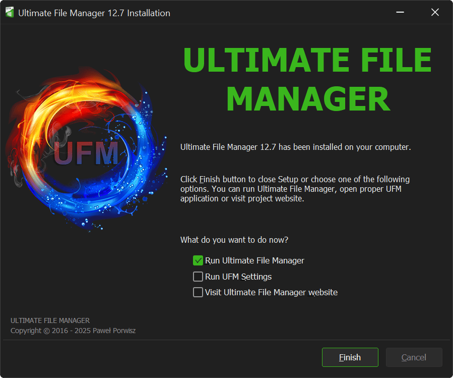 Clicking „Finish” button closes the installer window and completes installation process. If there are any actions marked to be performed, they will be performed. That's it! You are now ready to use the best File Manager for Windows!