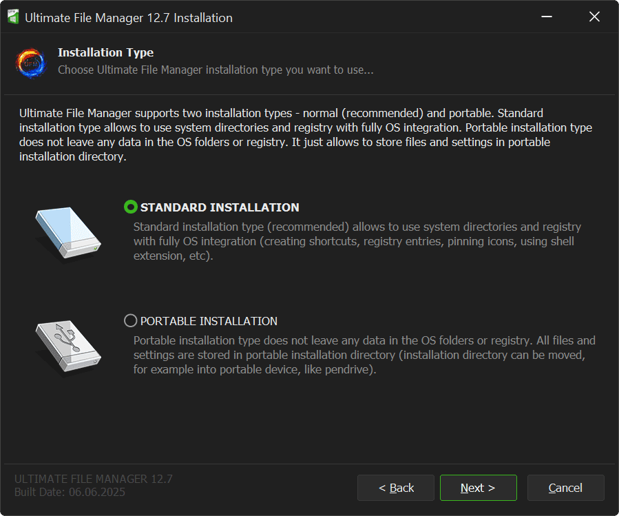 Next page of UFM Installer is the Installation Type page - Ultimate File Manager supports two types of installation - Standard (default) and Portable. They differ from each other fundamentally and determine how the entire package works.