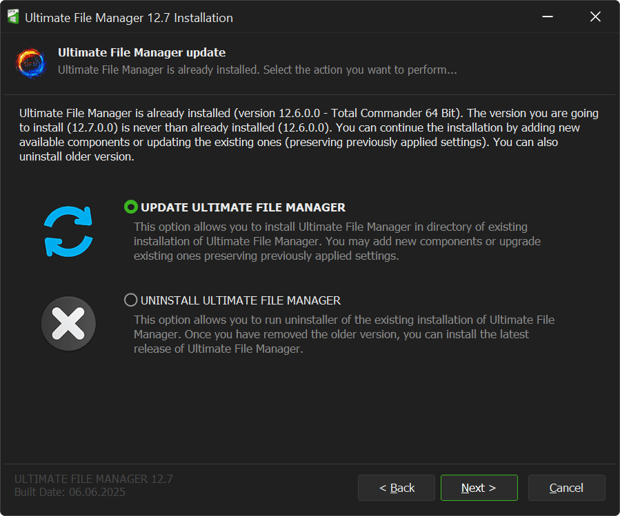 Selecting Ultimate File Manager Update option sets the installer to Update Mode. You can then add new components, remove or update existing components (applications, plugins, etc.). No user configuration files are modified (Note: File Manager menus and button bars are recreated and overwritten!).