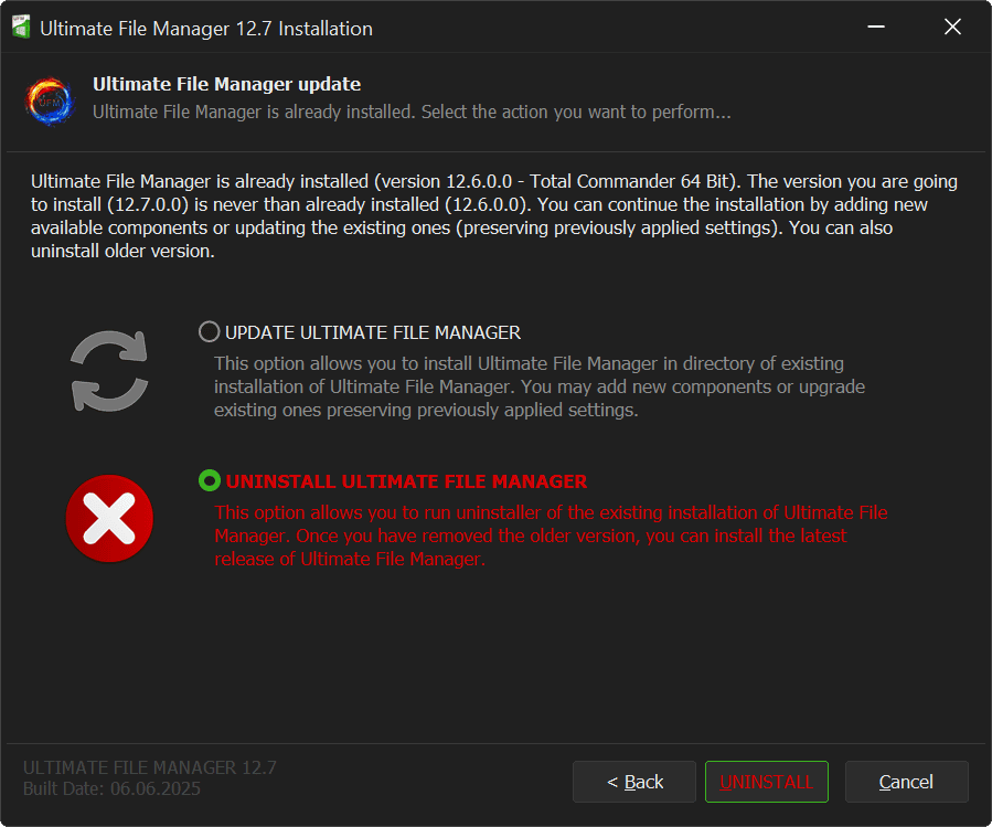 Selecting Ultimate File Manager Uninstall option closes the current installer and runs the uninstaller for the previous (already installed on the user's disk) version. Once all the files of the existing installation are removed, you can install the latest version of Ultimate File Manager.