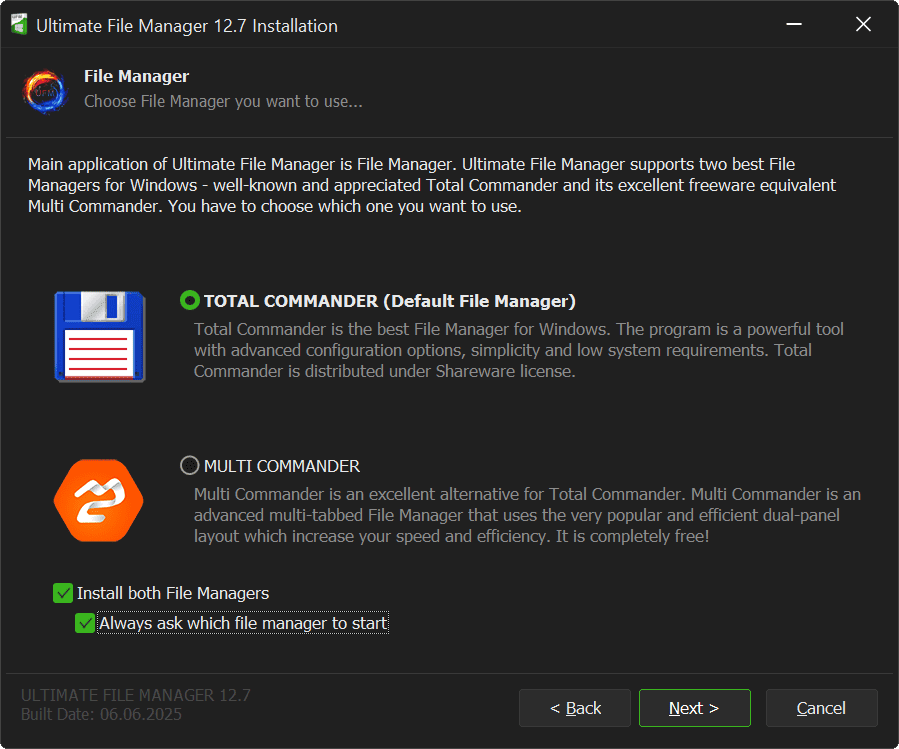 Next page of UFM Installer is File Manager selection page - the central application of the Ultimate File Manager. Ultimate File Manager supports both of two best file managers for Windows. We are talking about the well-known and respected Total Commander and its free alternative - Multi Commander. You can choose which one you want to use (you can install both at the same time!).