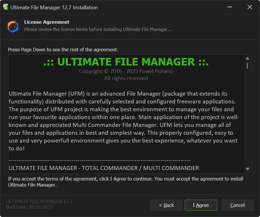 Next page of UFM Installer is the page where the license terms are presented. The license text contains information about the type of software being installed, a short description of the components being installed, the license terms (Ultimate File Manager itself and File Managers) and contact information. Project authors and translators are also indicated. System requirements and tools used to create the installer are presented.