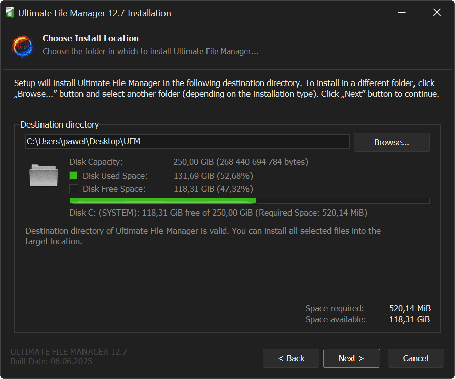 Next page of UFM Installer is the installation location selection page. The installation directory is the directory to which all the Ultimate File Manager files are copied. Depending on the type of installation and user preferences, it can be located in a different place. The installer proposes a default installation directory and informs about the space required to copy the files and the space that is available in the given location.