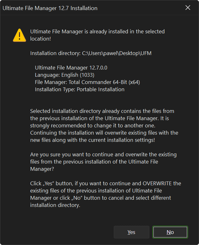 It may happen that you want to install Ultimate File Manager into an existing location (where the older Ultimate File Manager files are already located). In portable installation mode you can do this - but it has some consequences - all older files and all existing settings will be OVERWRITTEN by newer files and default settings. Therefore, you will be informed about it in advance and you must agree to it. It is recommended to simply change the installation location.